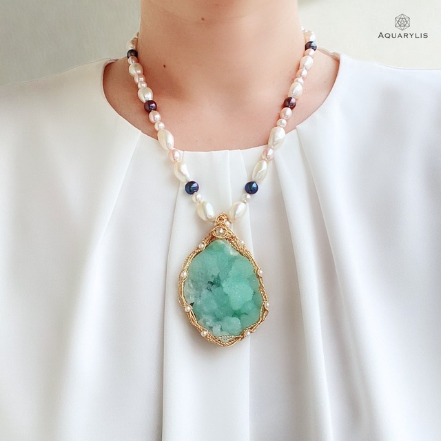 「Pleasure・喜びの花」希少フラワーグリーンアポフィライトネックレス ◆ International shipping guide https://aquarylis.official.ec/p/00002 ☆.+゚'・:*+☆.+゚'・:*+☆.+゚'・:*+☆.+゚'・:*+ 【あなたへのジュエリーメッセージ】 ◆「Pleasure(プレジャー)・喜びの花」 人生で最高の幸せが開花する あなたの得た喜びが花となり世界を彩ります 自分を信じて歩んできた全てのことが報われ、 祝福され、認められ、自分自身への愛しさが心を満たします。 これからも正直な自分に寄り添い、勇敢に生きるあなたへ この美しい結晶の花で胸を彩り、喜びを味わってください。 【ネックレスの特徴】 ・ミュージアムクォリティの希少石、グリーンアポフィライトを使用した一点物のネックレス。 ・高品質なインド・プーナ産出、中心の目を起点に360度、放射状に結晶化しているフラワーという形のグリーンアポフィライト。 ・アポフィライトは、半貴石類の中で最も光が強い天然石。こちらの結晶は、まるで光のプリズムのように燦然と輝く美しさが魅力です。 ・結晶の色彩は、内部から浮き出てくるようなアップルグリーン。 ・透明度に優れており、キラキラとした真っ白い輝きを放ちます。 ・結晶の全てを楽しんでいただけるワイヤリングデザイン。繊細で優雅な金のラインが花籠のように結晶を包んでいます。 ・装飾宝石には、大粒のダイヤモンド、グリーンサファイア、淡水パールを使用し、独特な複雑性のあるワイヤリングで職人の技術が光ります。 ・ネックレスはペンダントと一体型です。 ・高品質な南洋バロックパール、ブラジル産水晶、ヴィンテージの白いフラワーパーツを使用し、花咲くデザインのネックレス。 ・ネックレスの長さは約50cmあり、お洋服に合わせやすい長さです。 ・身につけた時、清潔感のある美しさや爽やかな輝きを引き立て、あなたを唯一無二の主人公へ輝かせてくれるでしょう。 ・ネックレスの金具は高級感のあるデザイン、簡単に身につけられるプッシュ式金具を使用。 *~*~*~*~*~*~*~*~*~*~*~*~*~* 【スペシャル】 ・こちらのネックレスは、専用のジュエリーケースに納めてお届けいたします。 ・この特別なネックレスをご購入いただいたお客様へ、ジュエリーのお手入れクロスをプレゼントに同梱いたします。 *~*~*~*~*~*~*~*~*~*~*~*~*~* 【天然石の意味】 ・フラワーグリーンアポフィライトは、あなたの力が最適な時に、最高の形で表現できることを手伝います。あなたに、自分が持つ光や魅力、核となる透明性、心が求めるメッセージに気づかせてくれるでしょう。また、迷いを打ち消し、何が自分にとって本望なのかを導く手助けをします。人生の物語の中で、あなたがよりよく生まれ変わり、自分と世界の完璧さを受け入れ、調和し、愛のハーモニーを創り出す力を高めます。 ☆*゚ ゜゚*☆*゚ ゜゚*☆☆*゚ ゜゚*☆*゚ ゜゚*☆ 【商品詳細】 ◆天然石:フラワーグリーンアポフィライト ◆装飾宝石:ダイヤモンド、グリーンサファイア、淡水パール ◆金属素材:14金ゴールドフィルド ◆金具素材:24金メッキSilver925 ◆結晶のサイズ感:縦約4cm×横4cm×厚み3cm ◆ネックレス重量:96g *~*~*~*~*~*~*~*~*~*~*~*~*~* 【誕生石・石言葉・意味】 ・グリーンアポフィライト 「夢の実現・豊穣・アバンダンス・無限の可能性・信頼」 ・ダイヤモンド・・・4月の誕生石 「絆を深める・永遠の愛・富や財産を引き寄せる」 ・サファイア・・・9月の誕生石 「勝利を呼ぶ・感覚を研ぎ澄ませ成功を収める・カリスマ性」 ・パール・・・6月の誕生石、9/8日の誕生日石 「女王の品格・愛と多いやり・円満な人間関係・守護」 *~*~*~*~*~*~*~*~*~*~*~*~*~* 【お勧めコーディネート】 ◆お揃いデザイン プレジャーブレスレット ◆お揃い色合わせ 翡翠&水晶ピアス https://aquarylis.official.ec/items/87013384 *~*~*~*~*~*~*~*~*~*~*~*~*~* こちらのネックレスは一点物です!! 「この石に何か惹かれる…」と感じたら…。 それは石からあなたへのサインかもしれません。 この機会をお見逃しなく! *~*~*~*~*~*~*~*~*~*~*~*~*~*~* 【ご購入の方へ】 * ジュエリー詳細カードとお手入れ方法を同梱。 * ジュエリーケース、リボンラッピング。 * ジュエリーお手入れクロスをプレゼント! 【ご配送について】 * 送料無料。発送日:月〜金。土日祝は休み。配送指定は2日後から可能。 *~*~*~*~*~*~*~*~*~*~*~*~* 唯一無二のジュエリーは、あなたの輝きを映し出すシンボル。自然な天然石の美しさは、あなたの毎日に笑顔をつくります♡ [AQUARYLIS(アクアリリス)]