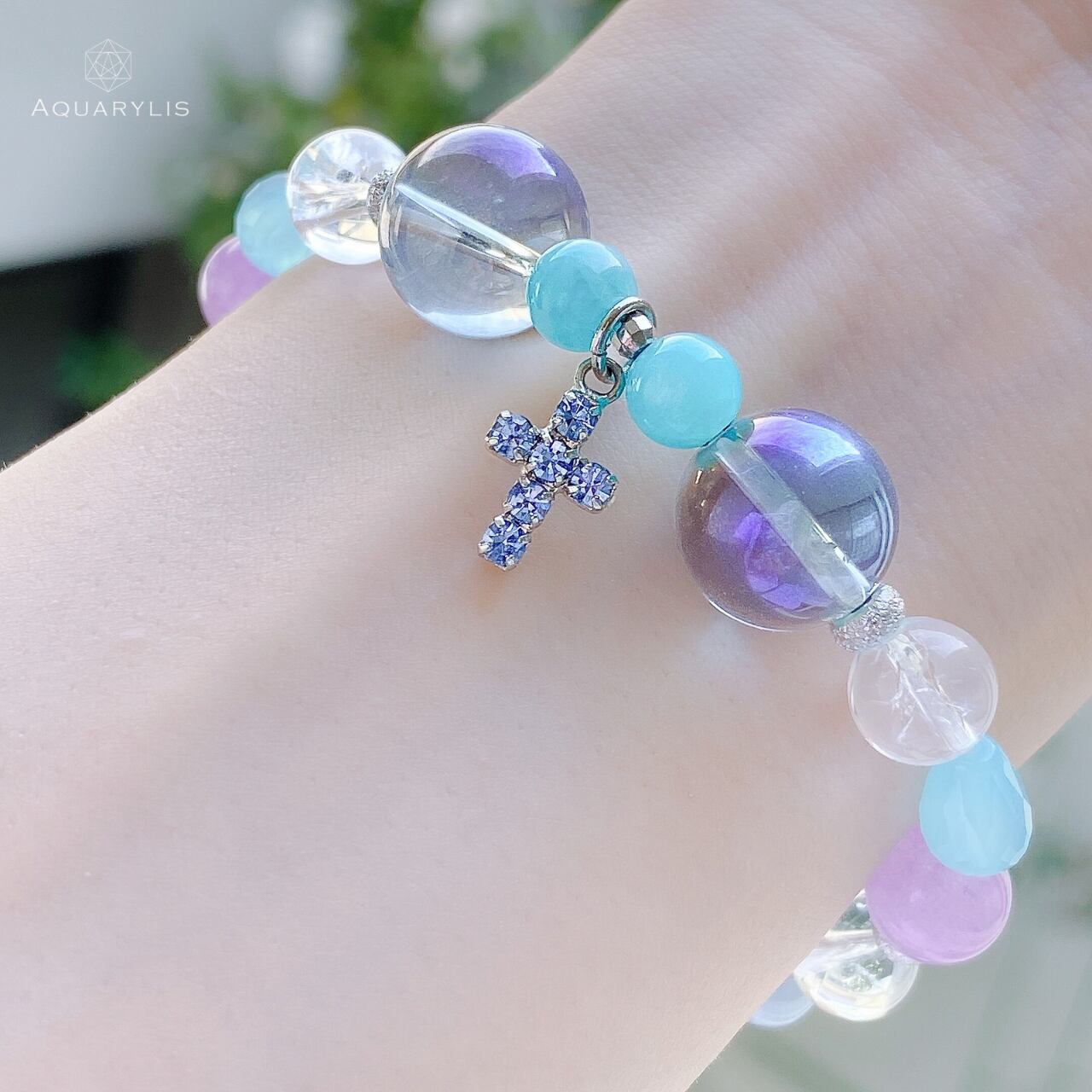 • アイスブルーのクロスチャームが反対側で揺れ、希望と祈りを表現。