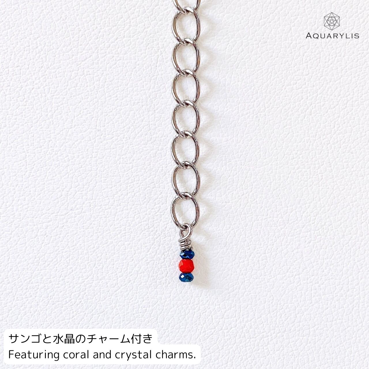 ◆アジャスターの先には、サンゴと水晶のミニチャームが揺れます。