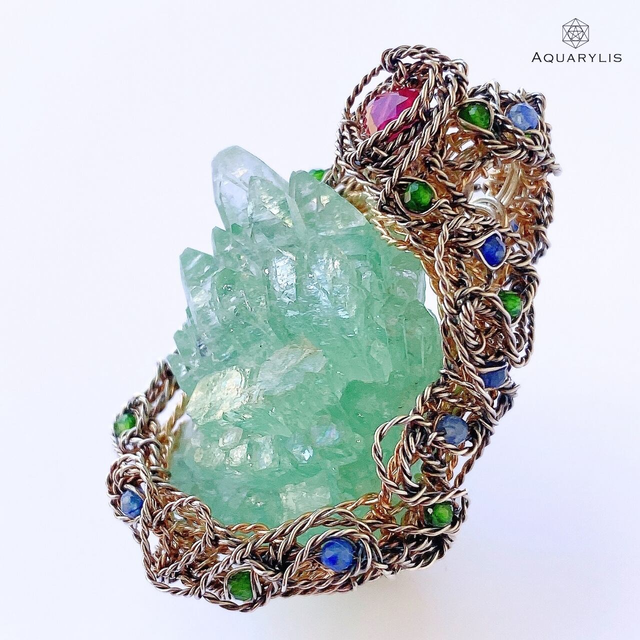 • 装飾石:ルビー(ハート)/ブルーカイヤナイト/グリーンダイオプテーズ。風・空・愛を象徴するカラー構成。