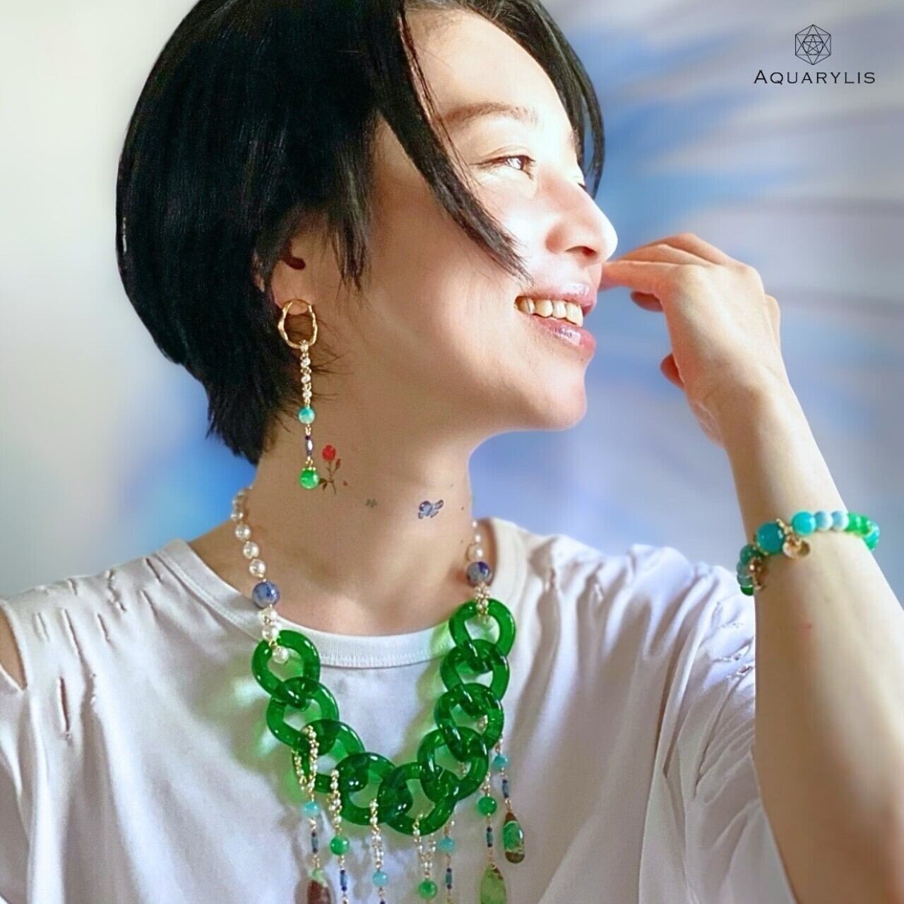 • アマゾナイトシリカ(ブラジル産)をメインに、翡翠、カヤナイト、トルコ製ガラスを組み合わせた軽やかなデザイン。