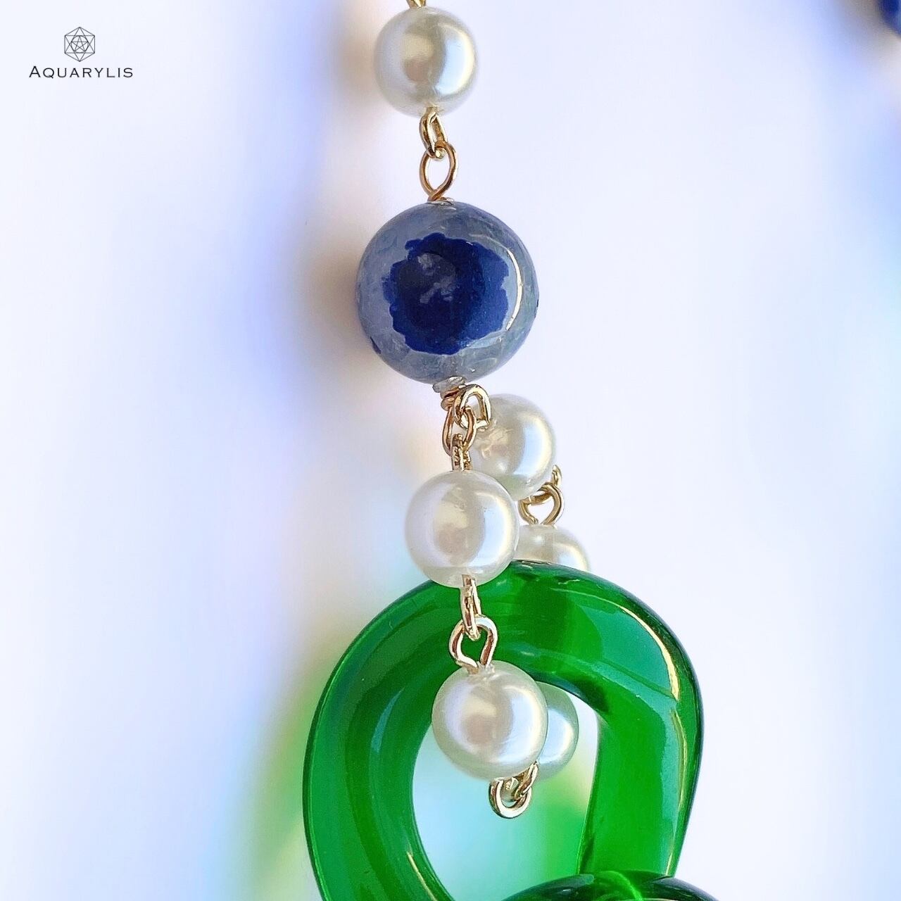 • 首元にはデュモルチェライト、アマゾナイト、カヤナイト、翡翠など青と緑の天然石を配置。