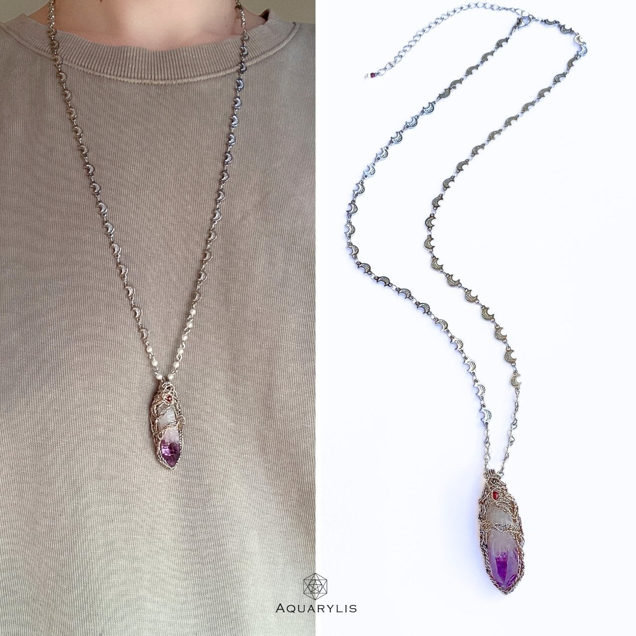 A poetic amethyst crystal with white quartz inclusions fading into a deep purple tip. Set in oxidized silver with subtle red spinel and hematite accents, and a moon-design chain (60 cm + 10 cm extender). The detachable pendant speaks in a calm, regal tone—quiet strength, luminous grace.