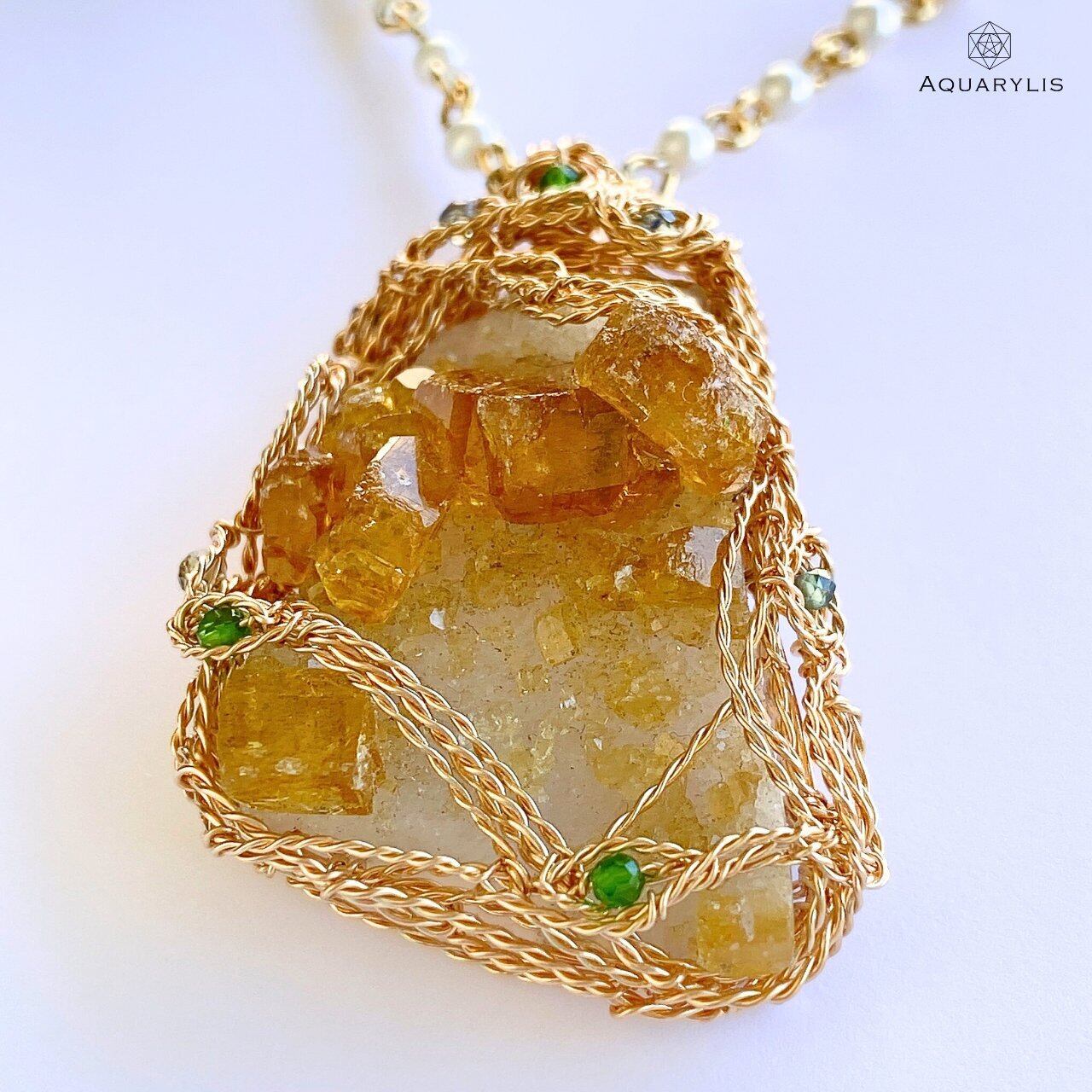 • センターストーン:透明感と奥行きのあるイエローバライト結晶(ブラジル)。展示用として流通することの多い“気象鉱物”を、装えるアートへ昇華