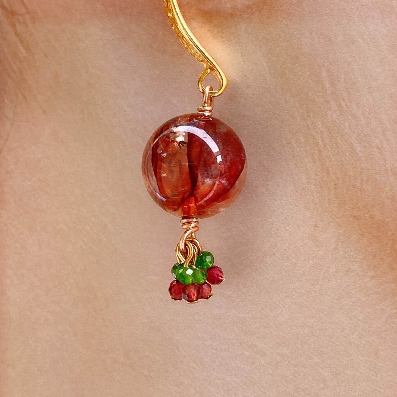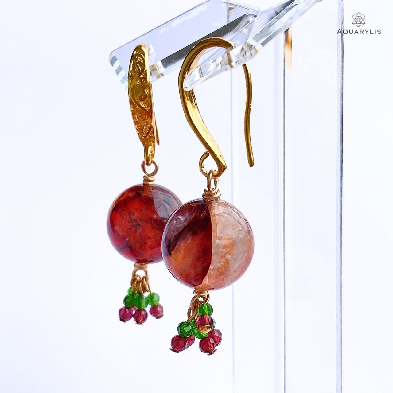 ・ガーネットとダイオプテーズのフリンジが軽やかに揺れ、華やかさをプラス