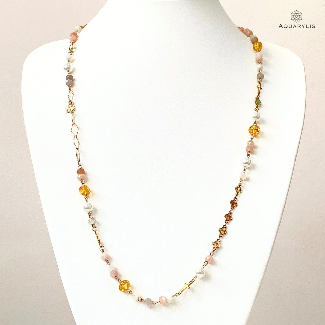 ・素材:リトアニア産アンバー、ムーンストーン、フェイクパール、14金ゴールドフィルド(K14GF)、ステンレス14KGF仕上げ