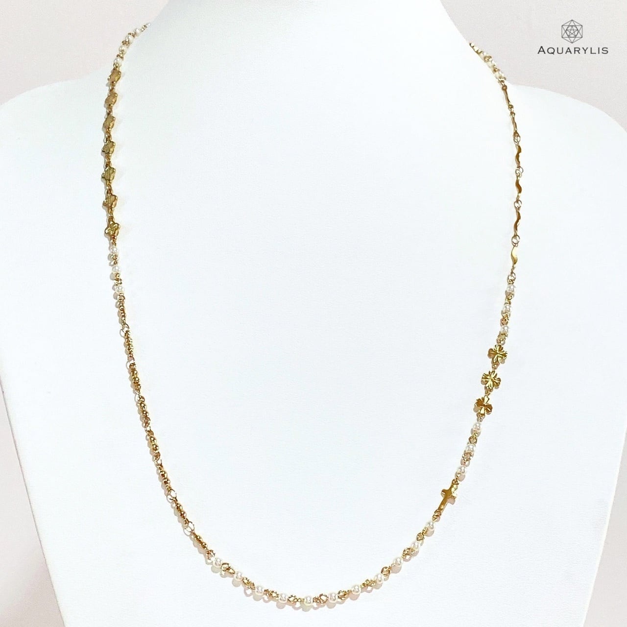 クローバーやクロス、パールが軽やかにつながるこのチェーンは、「何を合わせても素敵になる自分」でいたい日にそっと味方します。