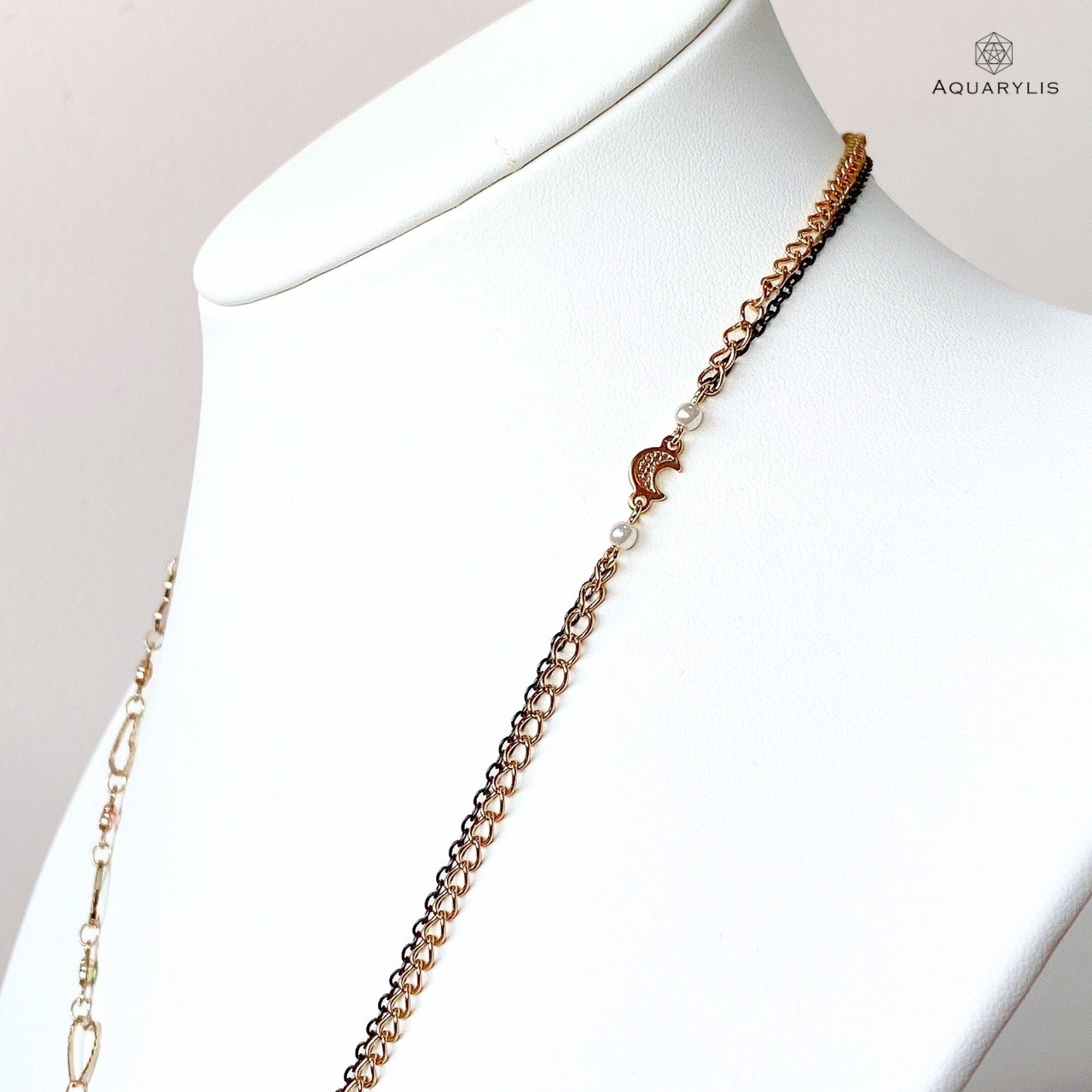 ハート&ムーンのロマンティックさと、ブラック×ゴールドのクールさ。2つの表情を一つに宿す、AQUARYLISらしいアシンメトリーチェーンです。