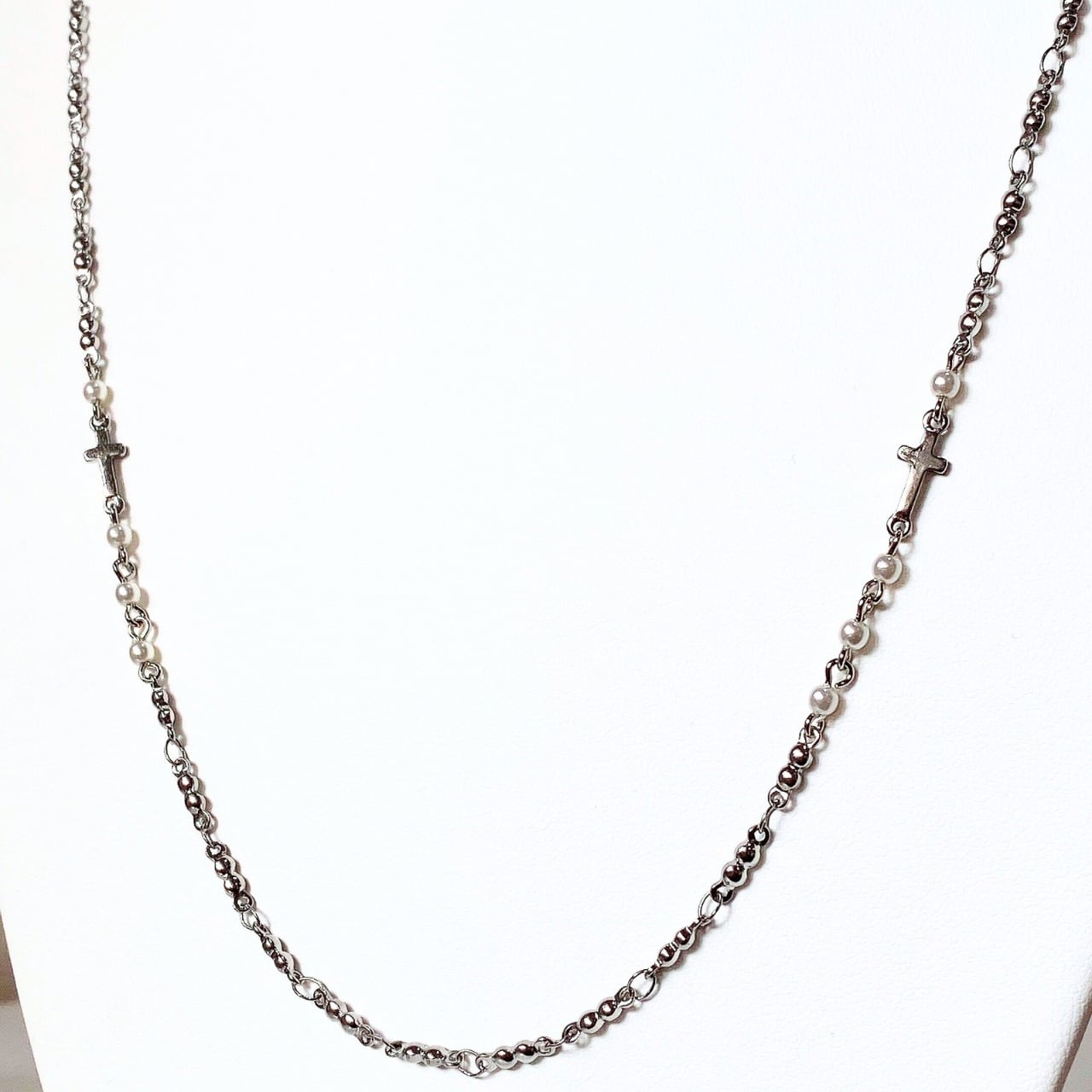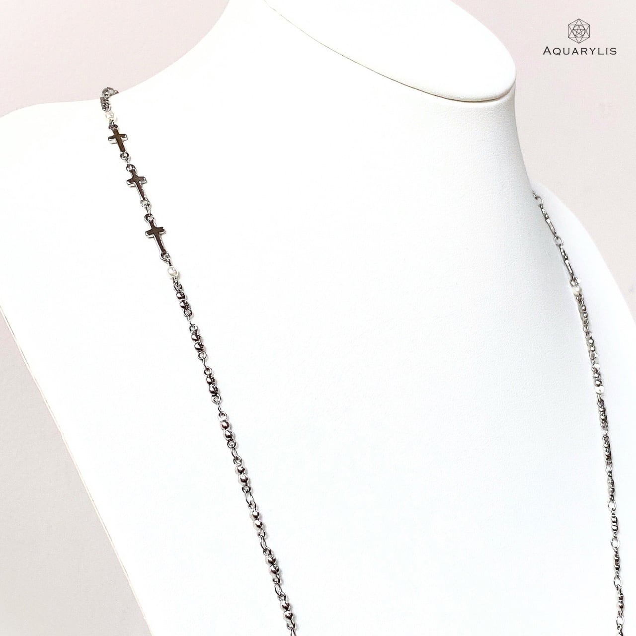 スマートなドットチェーンにクロスとパールを効かせたロング。チェーン単体でも、ペンダントを通しても、装いに上質な抜け感を添えます。