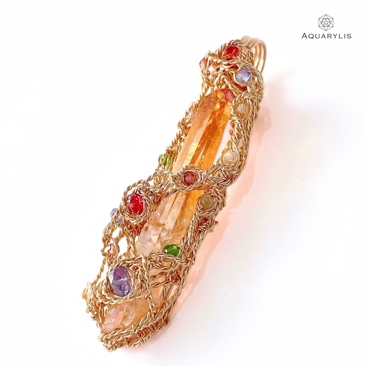 輝くオレンジ色に虹のようなオーロラ色が光る天然石。(水晶にチタンとプラチナを蒸着させてレインボーの輝きを生み出しています。)