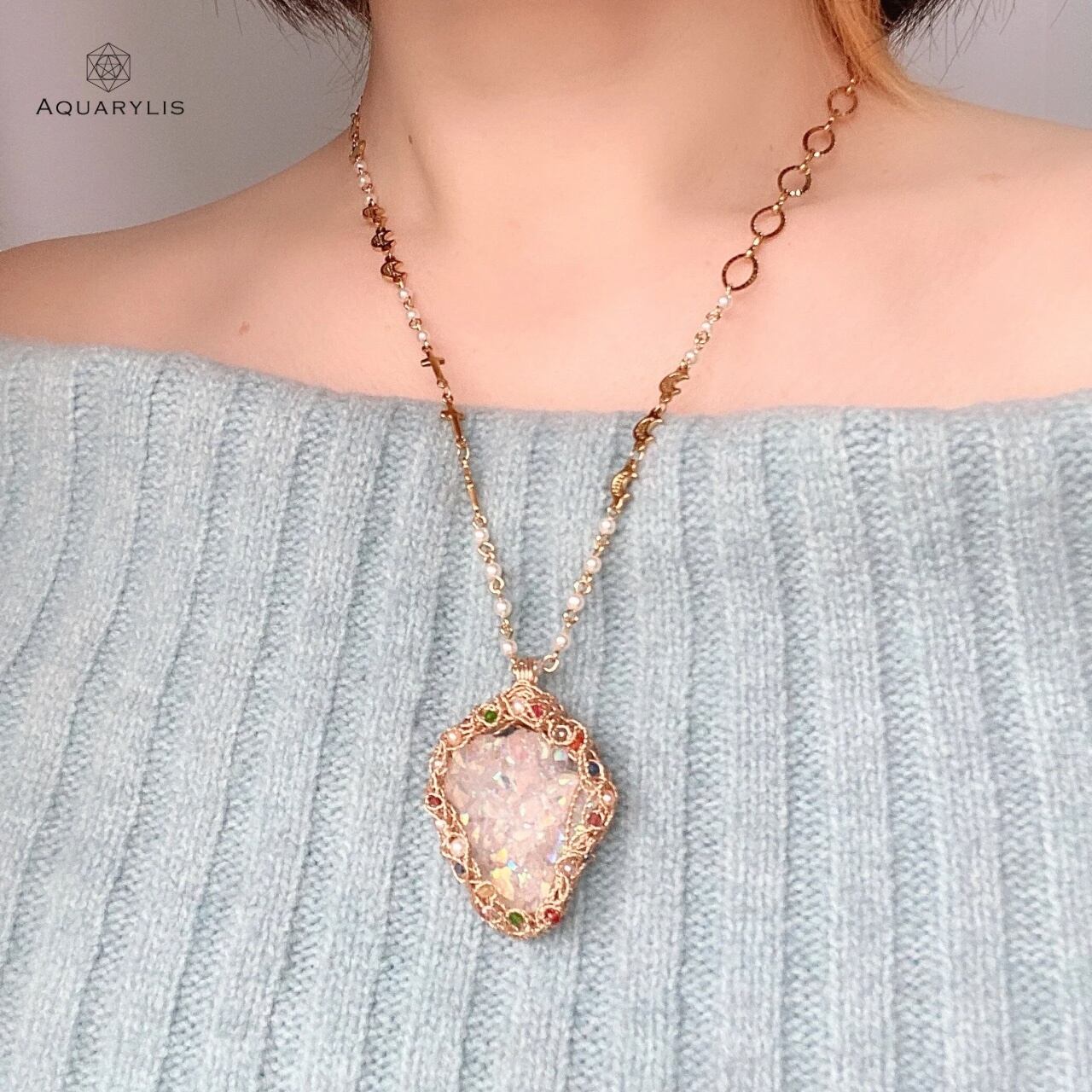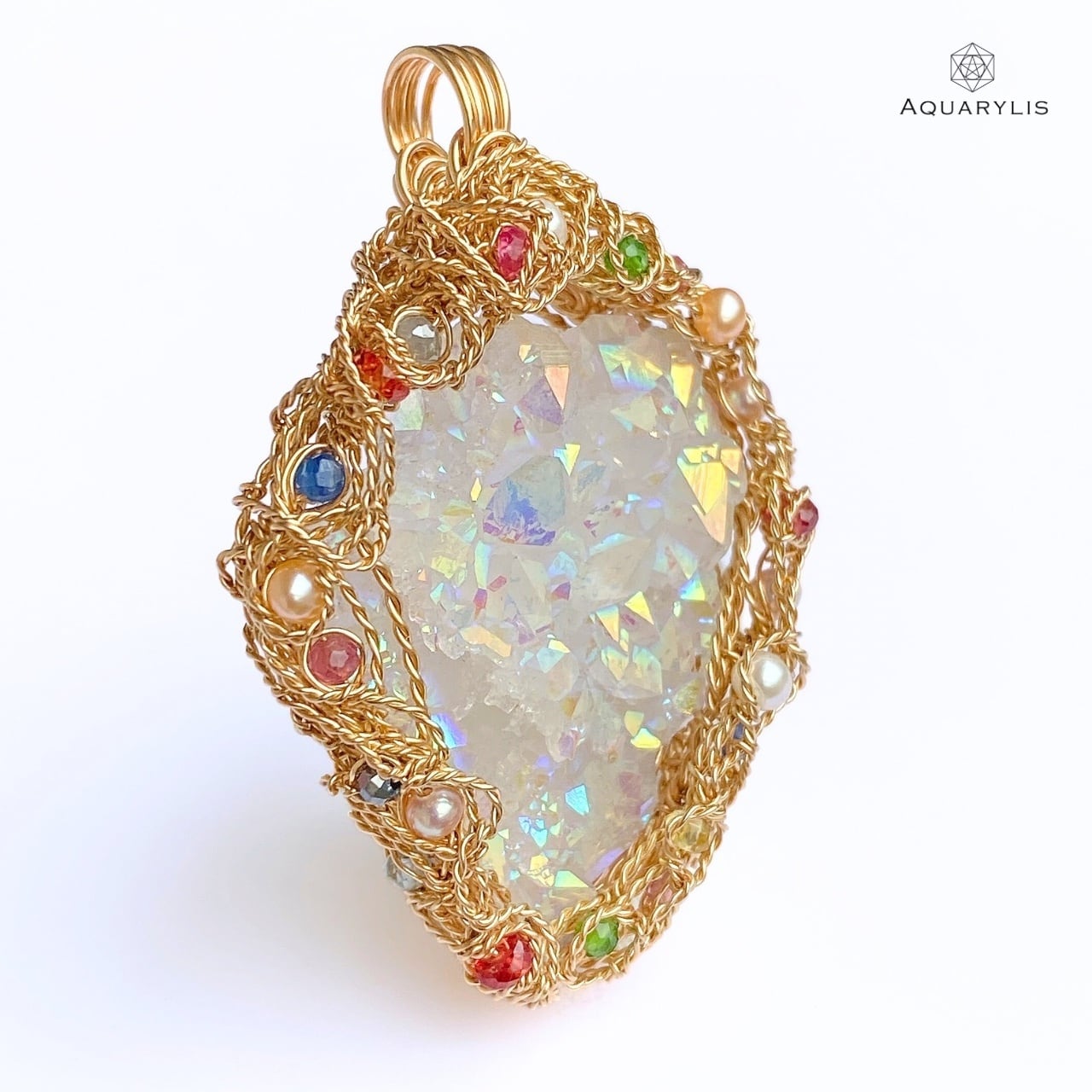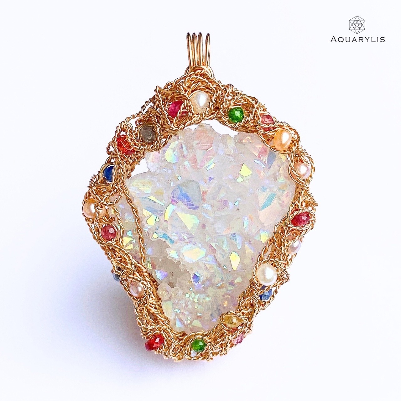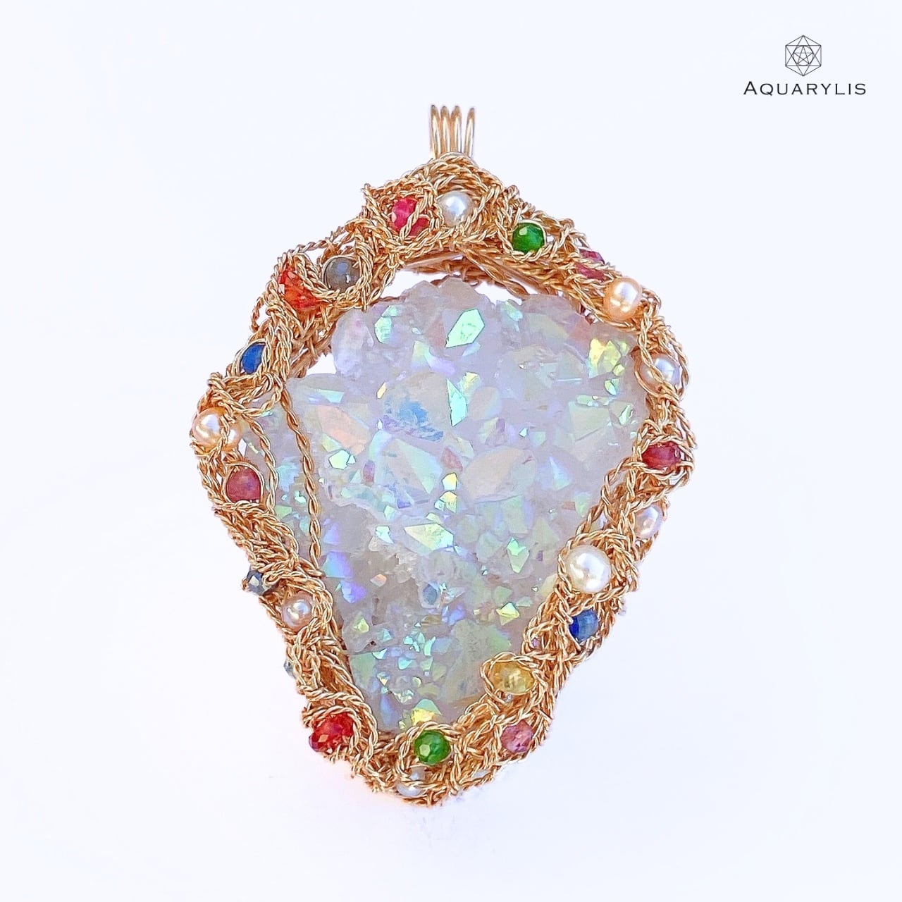 見ているだけでトキメク虹色の輝きを、あなたの胸に。エンジェルオーラが放つクリアーで純粋な光は、きっとあなたの心に希望の光を灯してくれるはずです。唯一無二、ペンダントのデザインは、色とりどりの装飾宝石がポイントです。繊細に丁寧にワイヤリングを施しています。