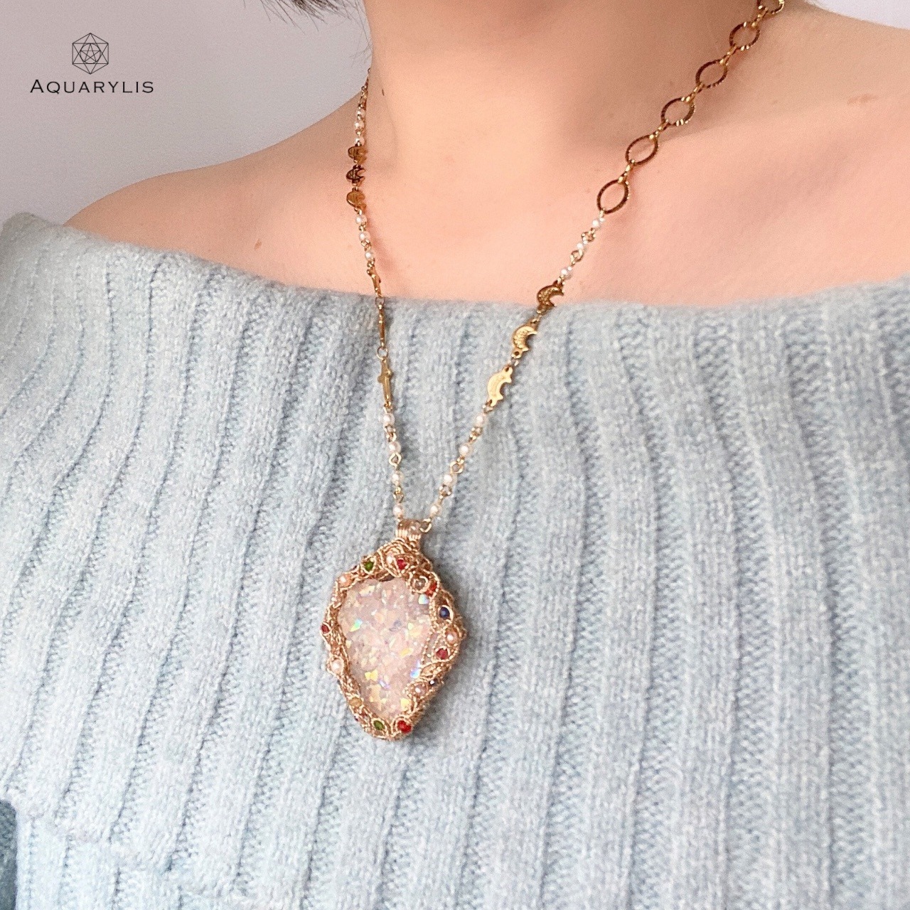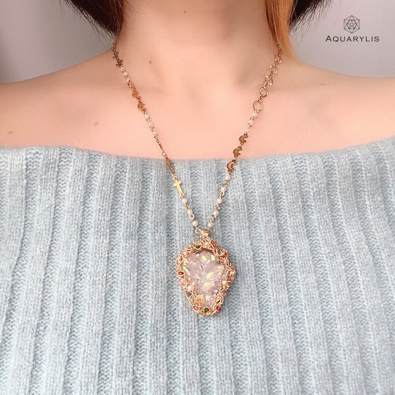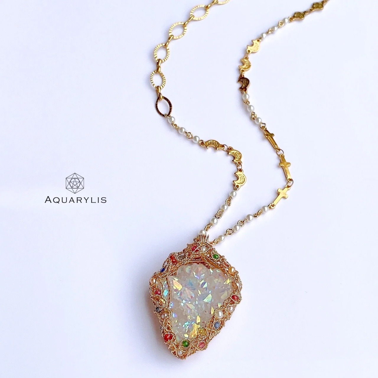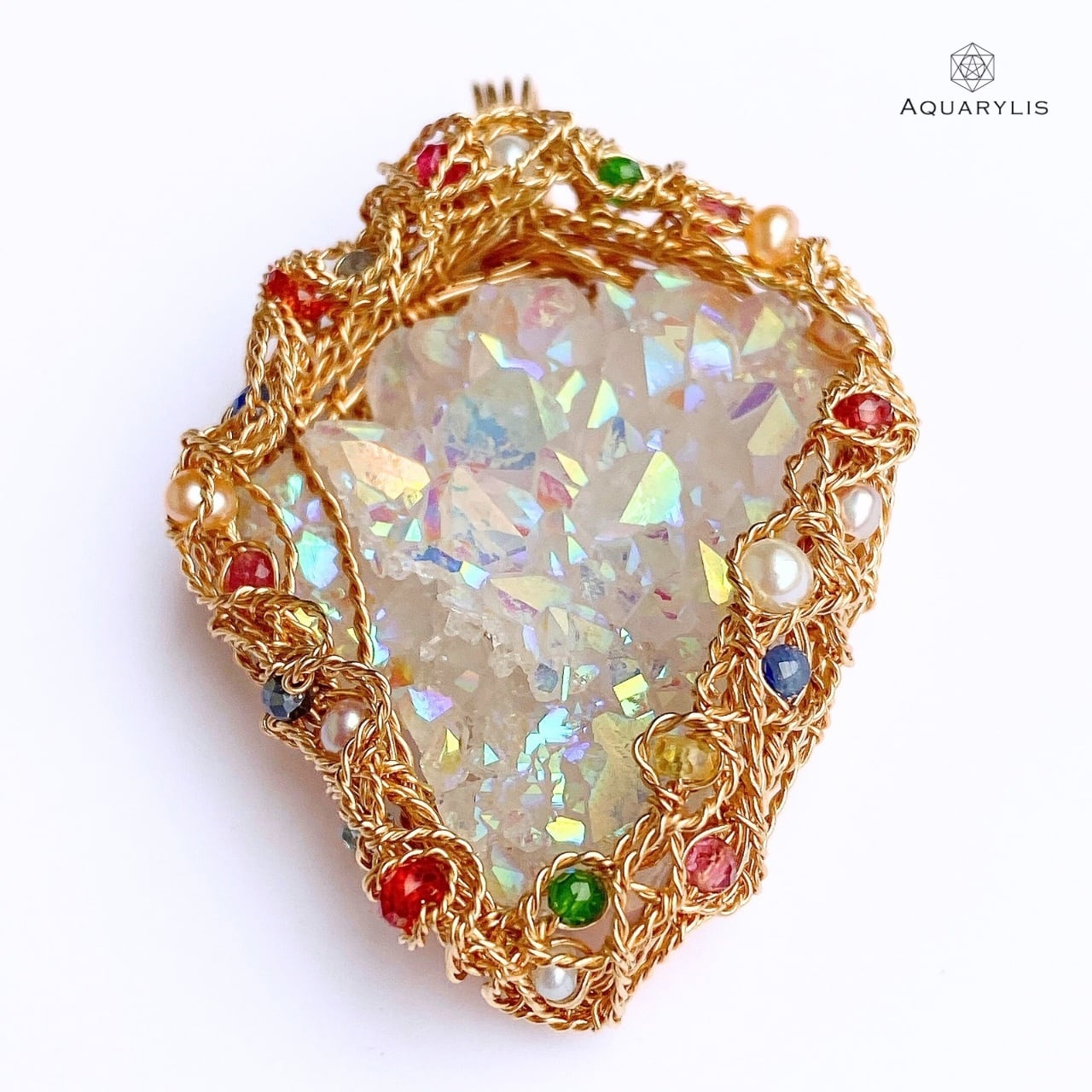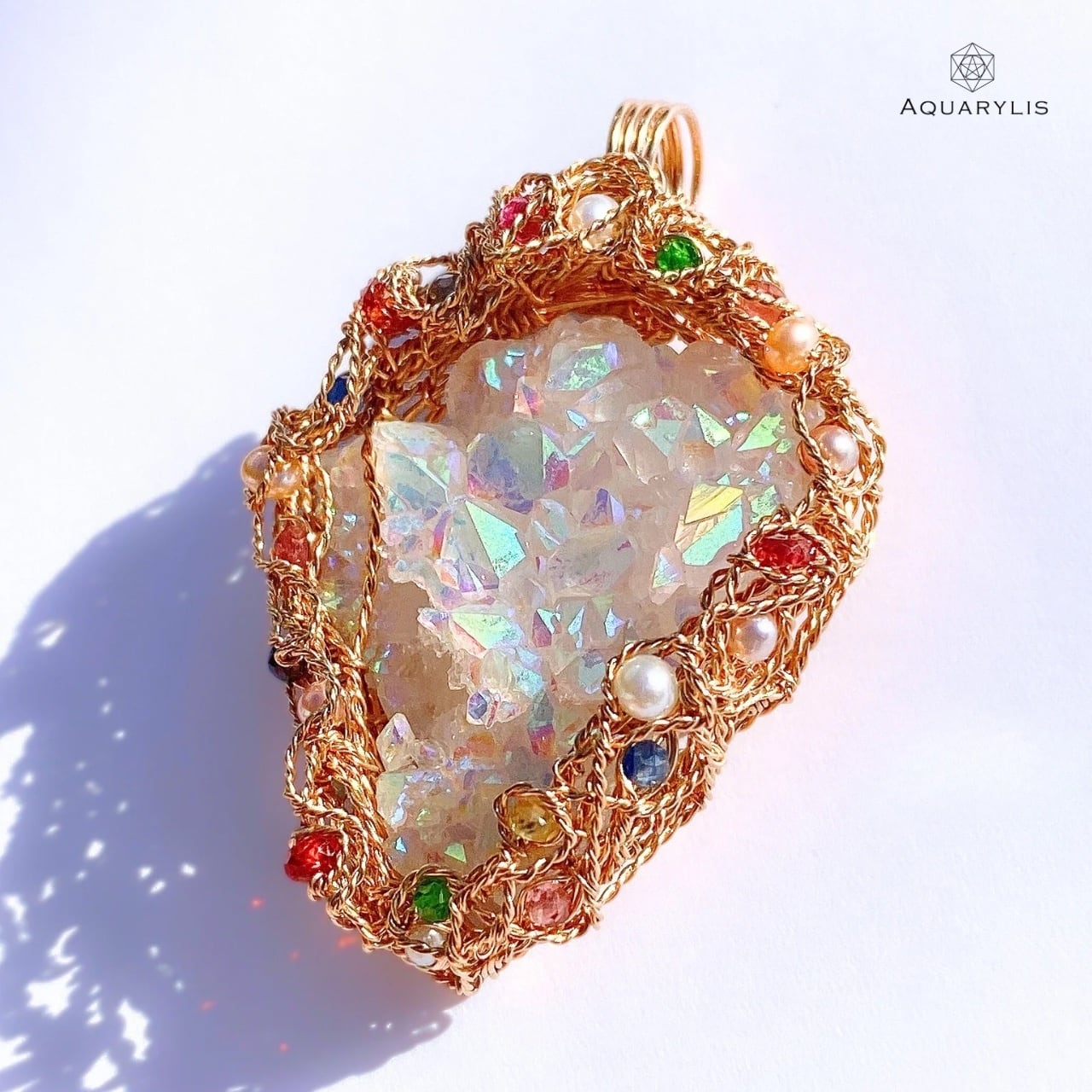 見ているだけでトキメク虹色の輝きを、あなたの胸に。エンジェルオーラが放つクリアーで純粋な光は、きっとあなたの心に希望の光を灯してくれるはずです。唯一無二、ペンダントのデザインは、色とりどりの装飾宝石がポイントです。繊細に丁寧にワイヤリングを施しています。