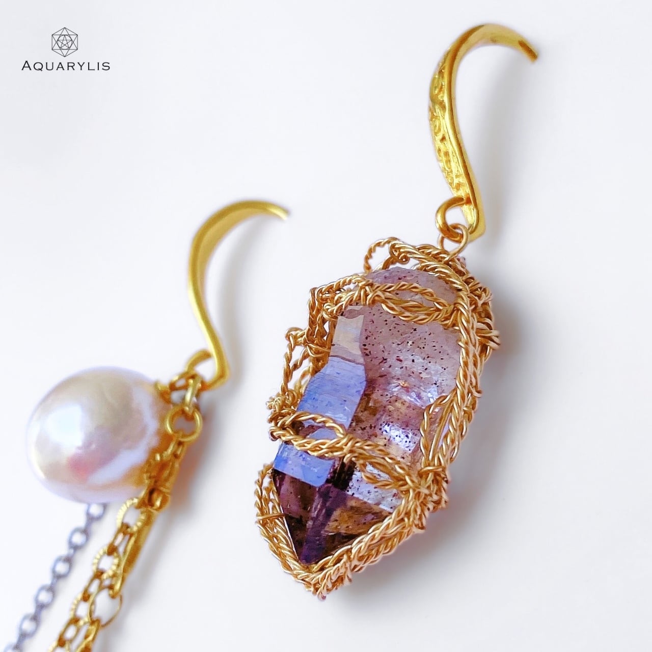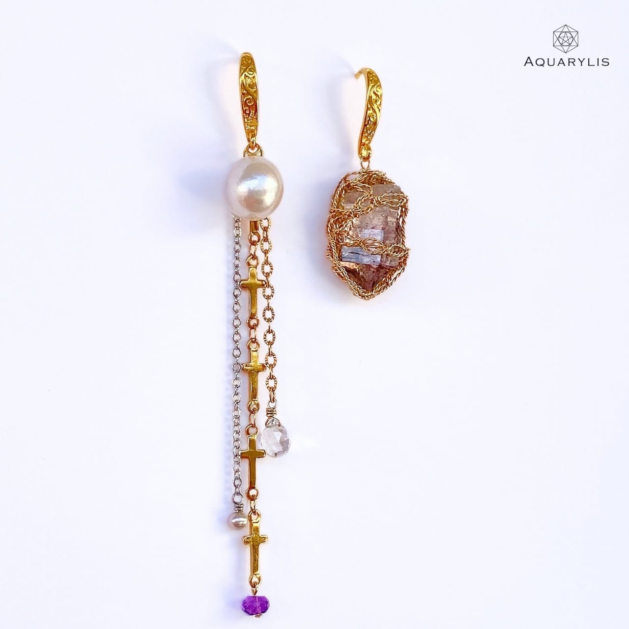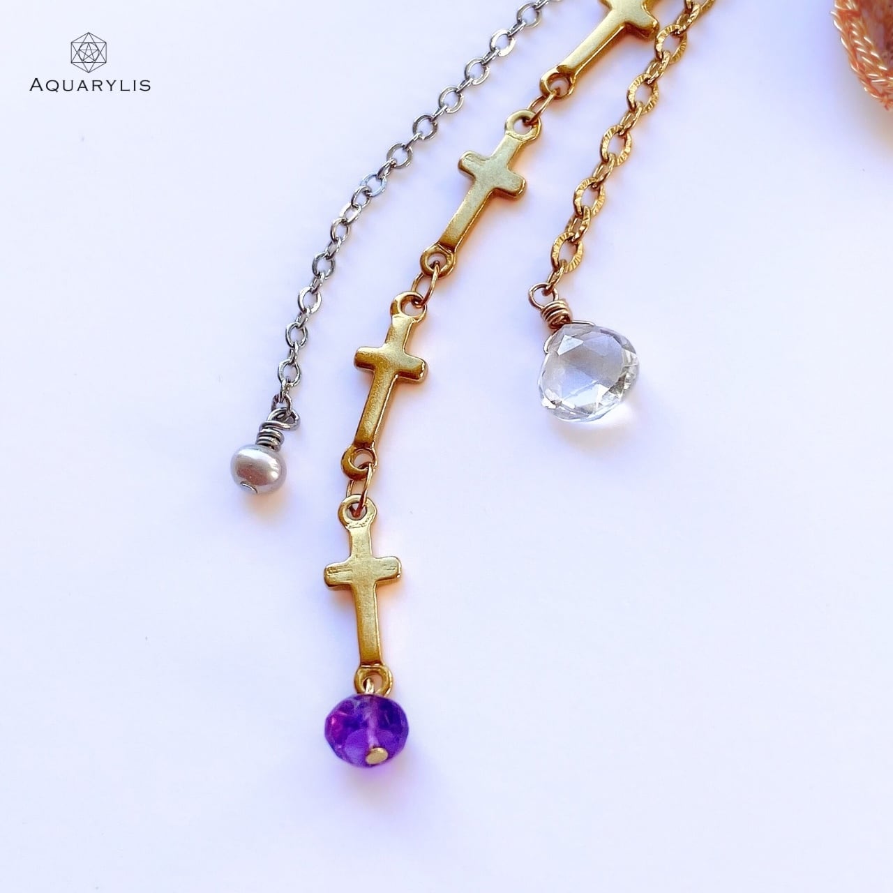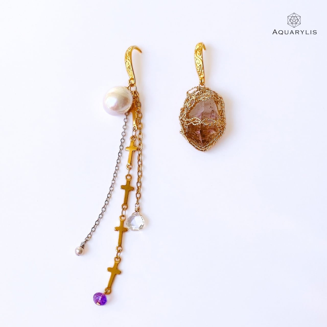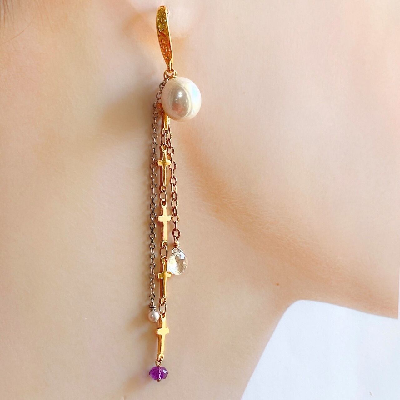 • デザイン:左右のバランスを良くカラーをコーディネート。チェーンから揺れる、水晶、シルバーカラーの淡水パール、アメジストが綺麗に輝きます。