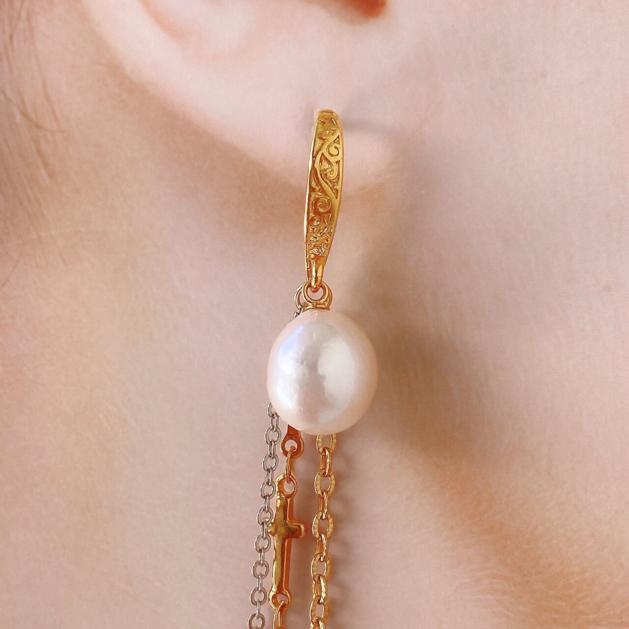 • チェーン:クロスモチーフ、シルバー&ゴールドのフープチェーン