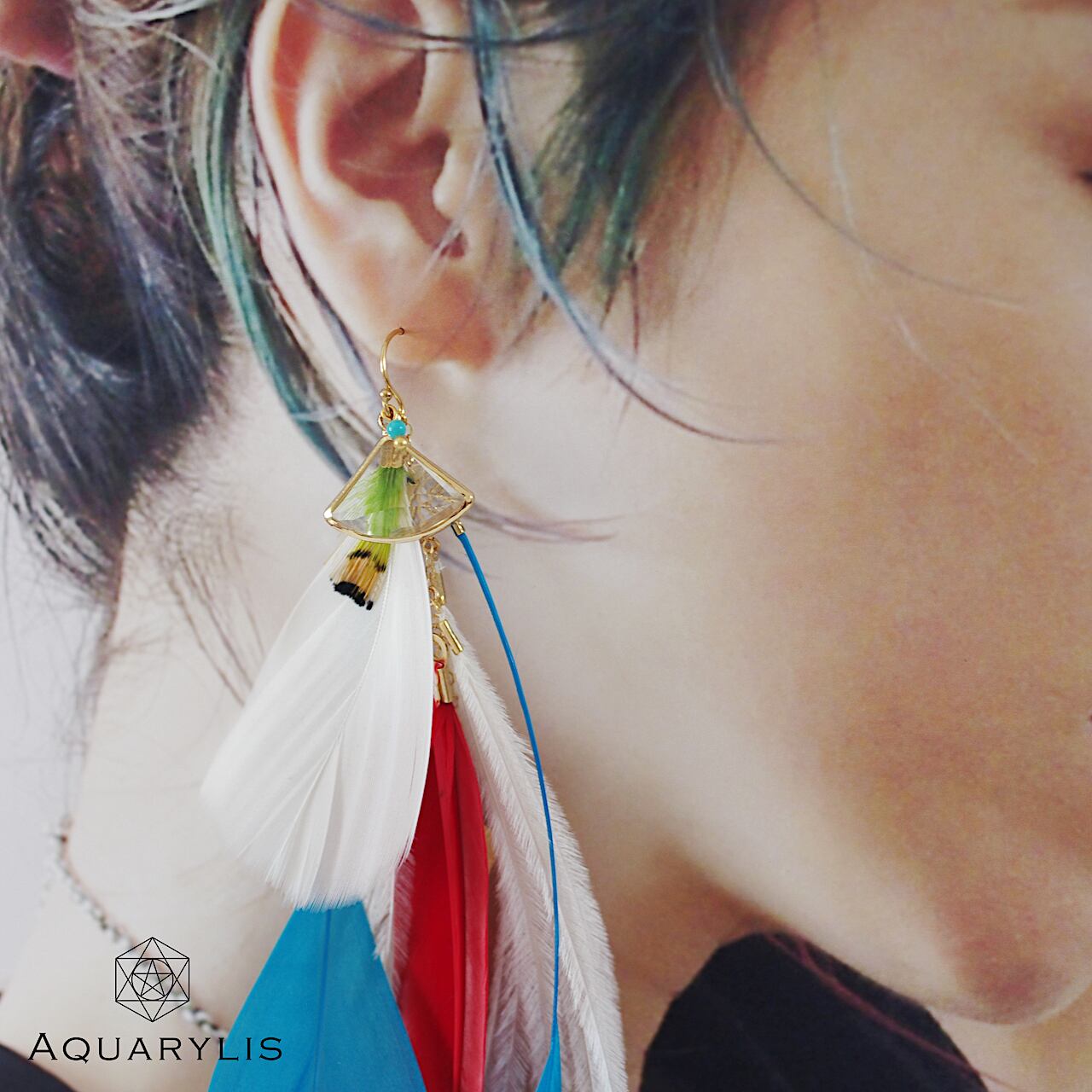 「青空を自由に舞う鳥のように」こんなイメージから誕生した一点限りの羽ピアスです。軽やかで清潔なホワイトを基調に、情熱的なレッドやターコイズであなたの魅力を印象的に高めます。