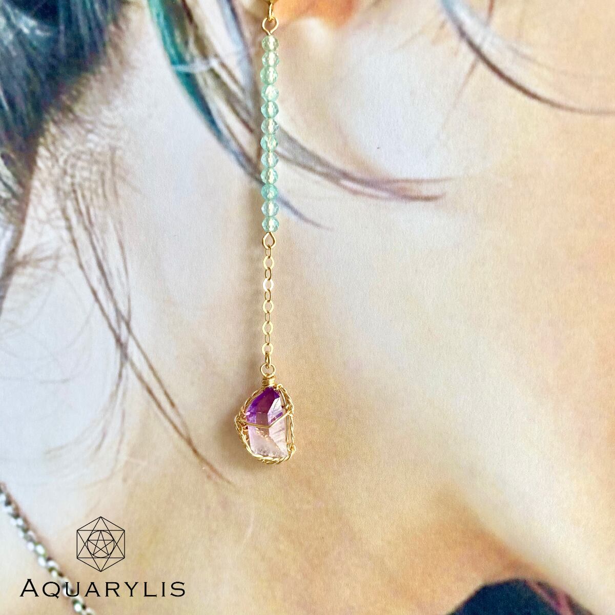 宝石質で小ぶりな結晶がきらめき、太陽の光に透ける紫色に心が癒されるでしょう。アメジストとコーディネートしたアクアマリンは、「美と創造力」を高める宝石です。繊細なカットがほどこされており、耳元でキラキラと輝きあなたの魅力を一層引き立てます。