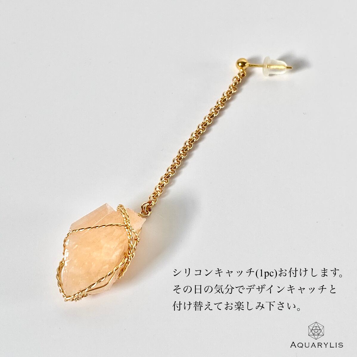 また、片方はパープルのフローライトの原石を使用したキャッチがポイントになっています。耳たぶを挟むようなかたちのデザインで、あなたの後ろ姿も綺麗に演出します。なお、気分に合わせてお色直しができるように、透明のシリコンキャッチもお付けいたします。