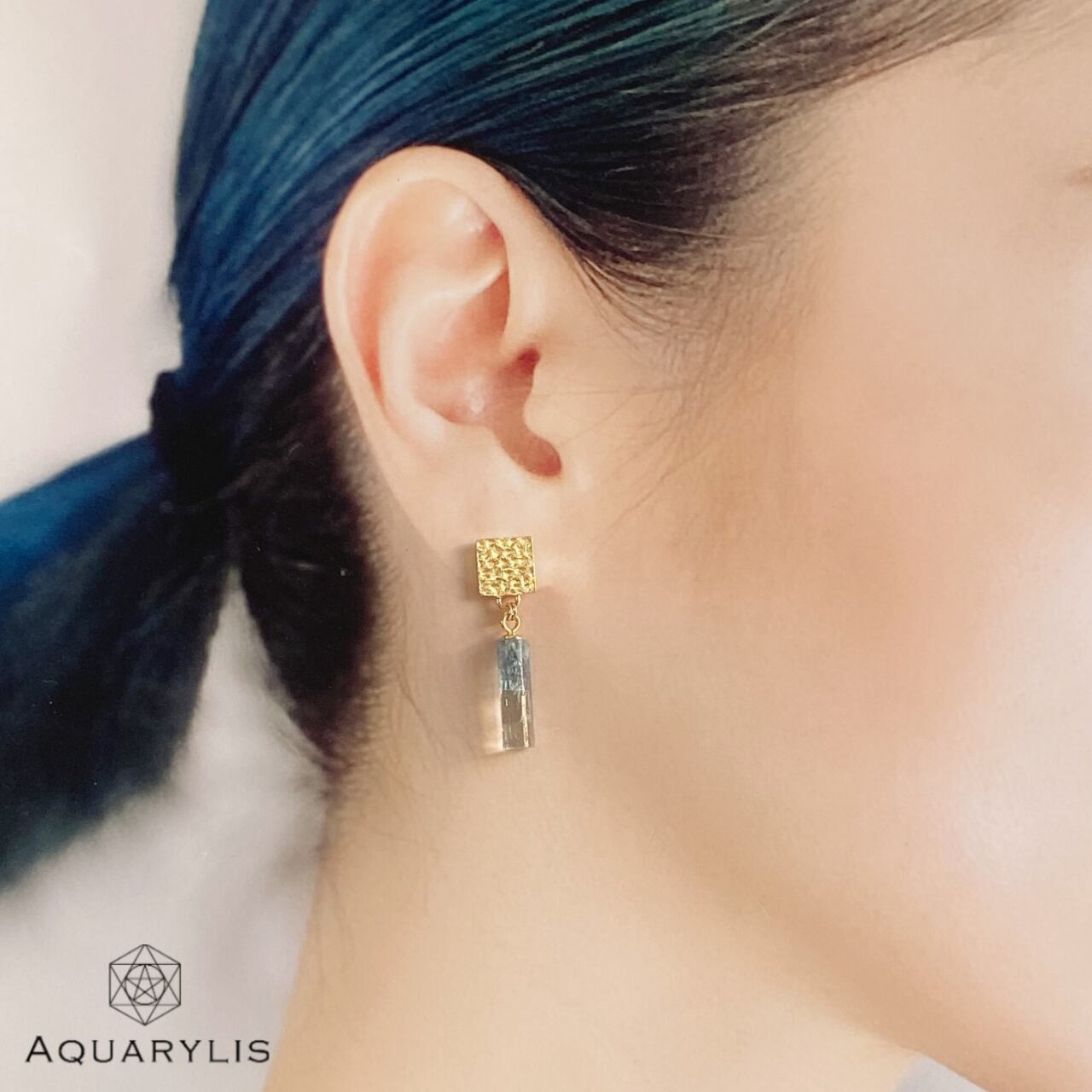 こちらのピアスには、アフリカ大陸ナミビアの大地から育まれた宝石質なアクアマリンを使用。その名の通り綺麗なアクアブルーのお色味で、水を結晶化したような神秘的な原石です。