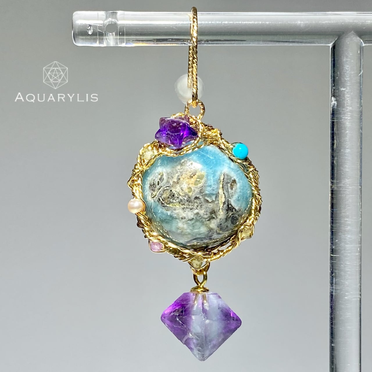 ・14金ゴールドフィルドとスターカットのアメジスト、サファイア、スリーピングビューティーターコイズ 、淡水パールを使用し、繊細なワイヤリングで丁寧に仕立て上げられた大人の鉱物ジュエリー。