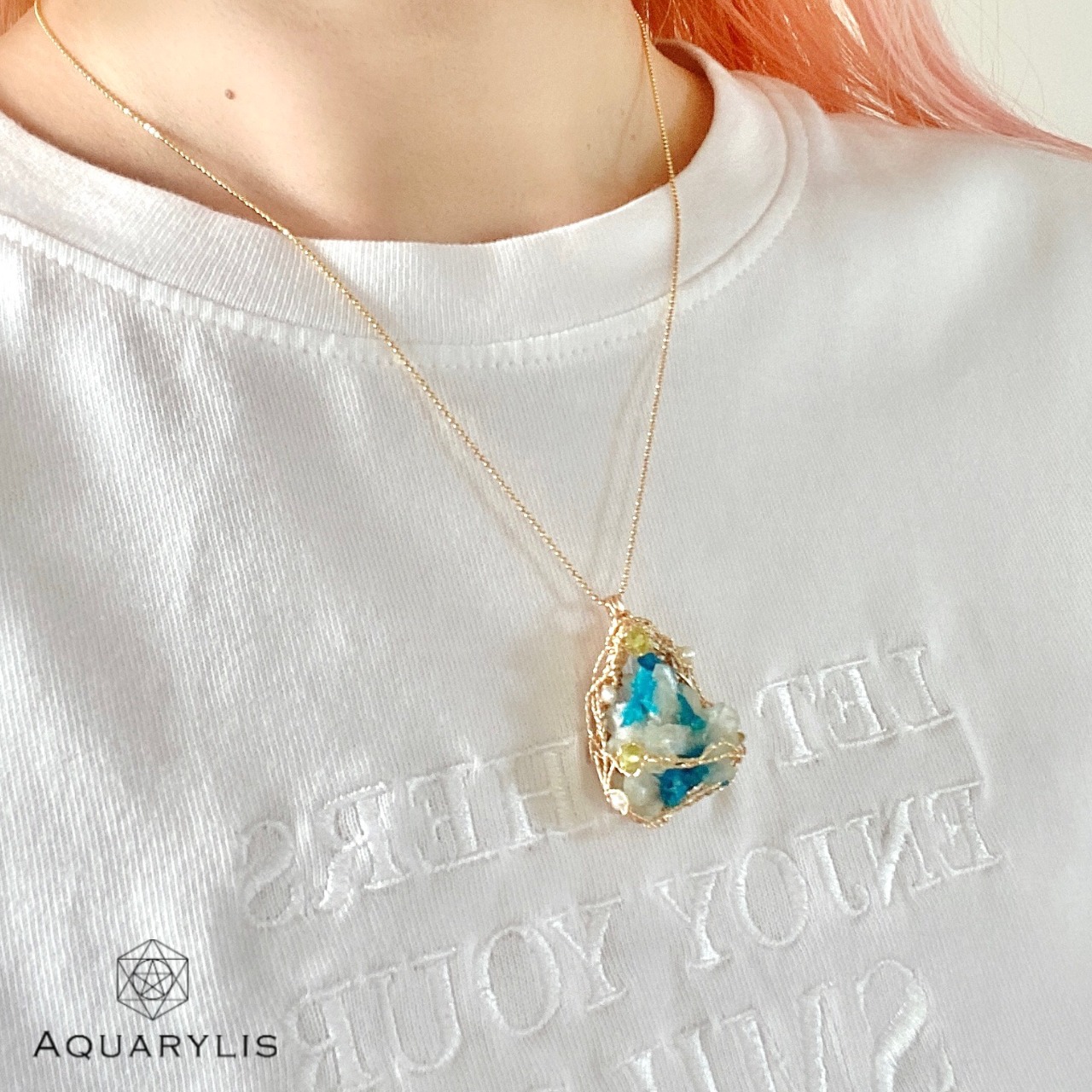 ペンダントのデザインは、ブルーとイエローを基調にポップな雰囲気にお仕立てしております。装飾には、宝石質なイエローアパタイト、淡水パールを使用。カヴァンサイトの結晶を隠すことなく活かしたワイヤリングワーク、あなたのセンスを光らせるデザインが特徴です。