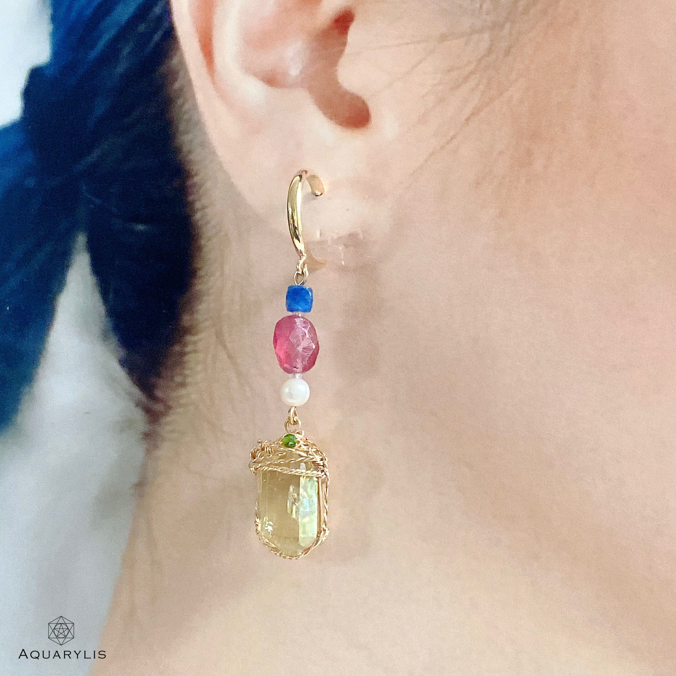 ゴールドの小さめフープピアス、ロイヤルブルーのカヤナイト、ピンクサファイア、淡水パールを使用。アパタイトは、結晶の形を活かした繊細なワイヤリングワークにグリーンのダイオプテーズを使用し個性を出しております。