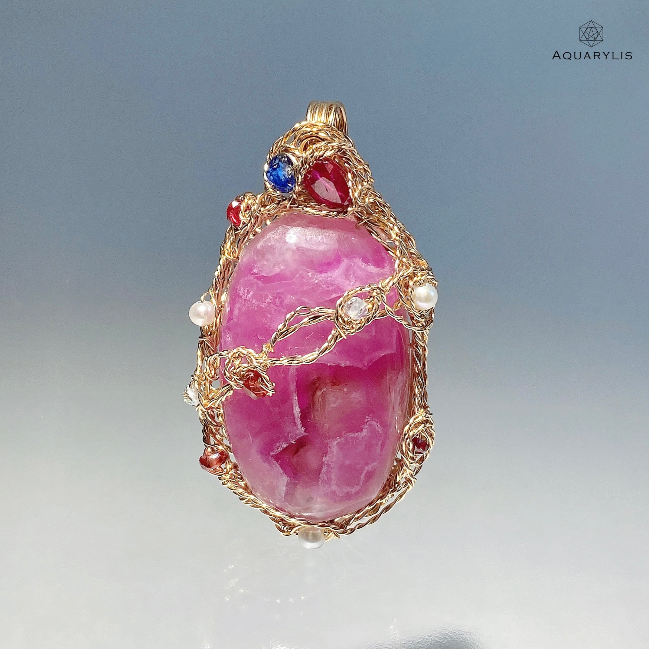 ハートシェイプのルビー、カヤナイト、レッドスピネル、ブルートパーズ、淡水パールを使用。