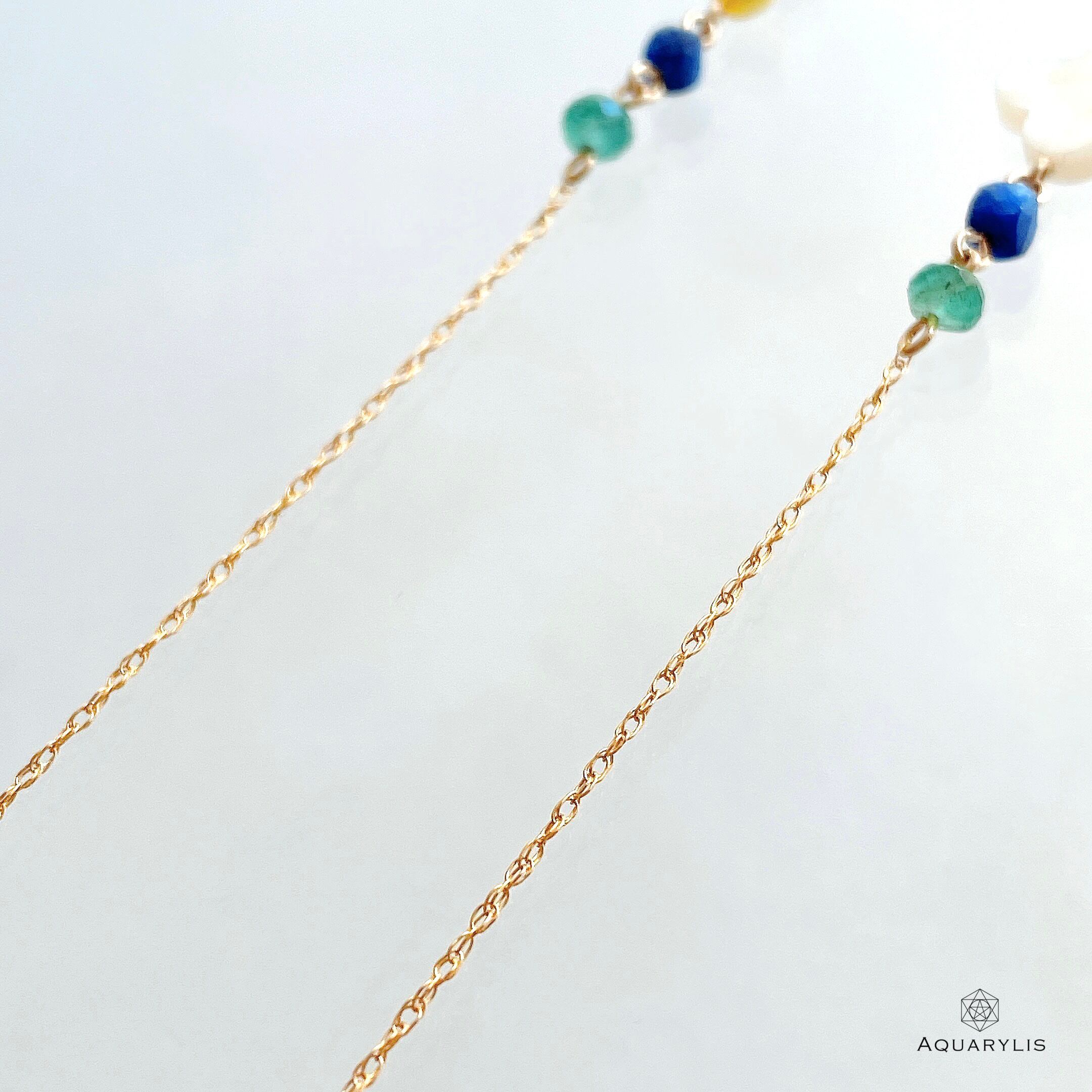 フローライト、淡水パール、マザーオブパール、ハート型のアメトリン、カヤナイト、エメラルド