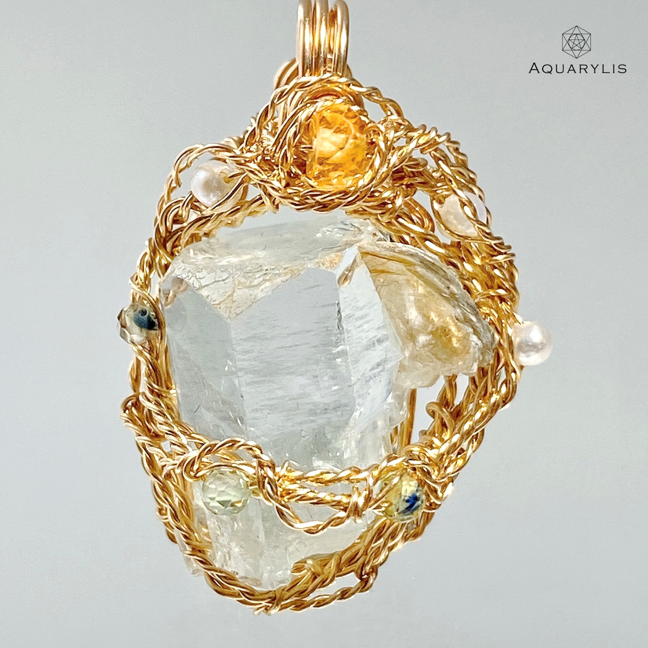 ・アクアマリンとマイカの結晶を、フワリと包むようなデザイン。結晶の外見がよく見えるようにお仕立てしております。
