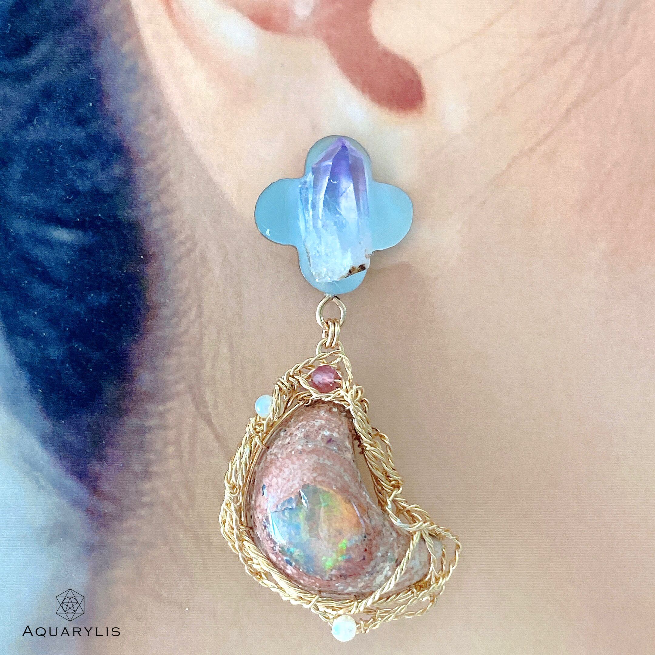 こちらのピアスには、高品質で優美なメキシコ産のカンテラオパール&アメジスト、ブラジル産のバイカラートルマリン&アクアマリンを使用。ユニークな原石達のポジティブでカラフルな魔法が、あなたの魅力を一層輝かせてくれます。
