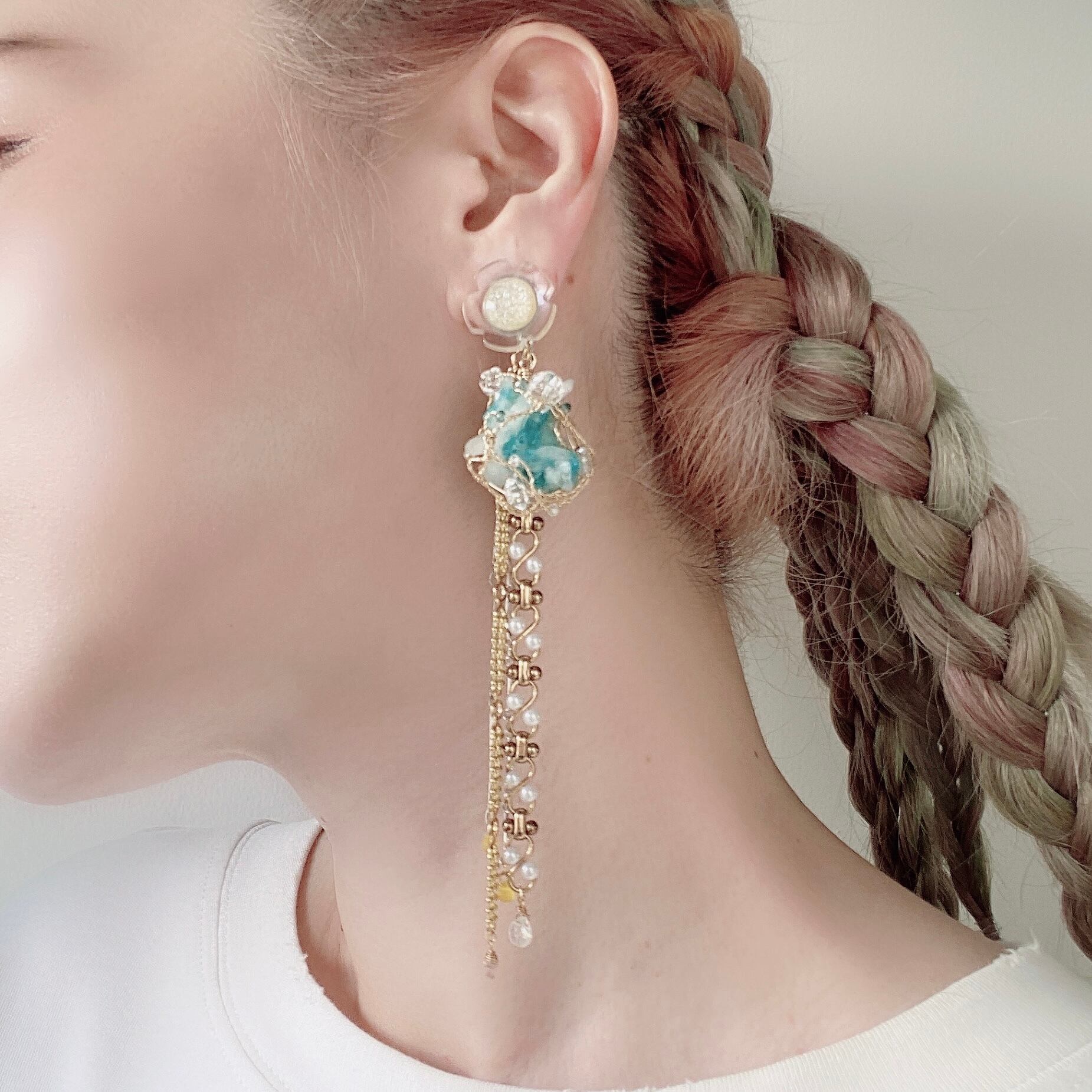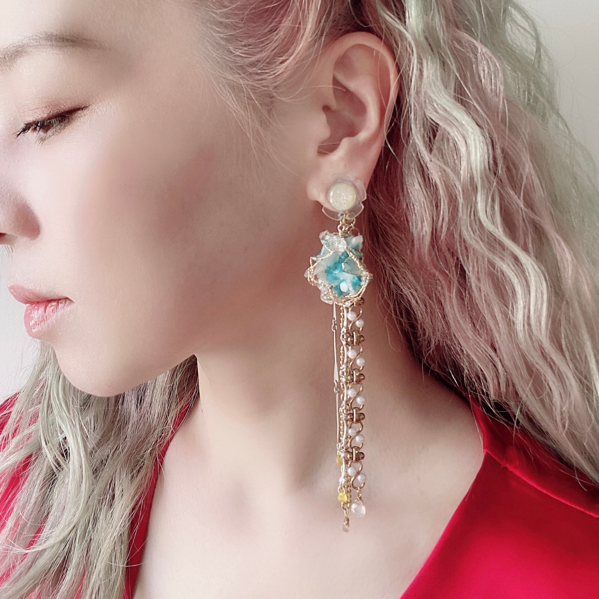☆アクアリリスからのお勧めは、左右違うロングピアスでのコーディネート。または、お手持ちのピアスを利用して左右アシンメトリーで身に着けるのが最新のおしゃれです。
