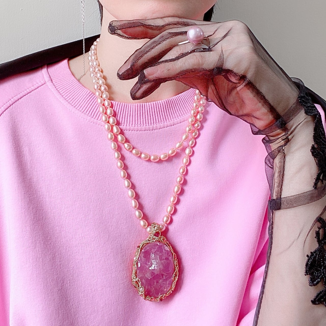 「Heart♡心」全結晶ピンクコバルトカルサイト2連パールネックレス