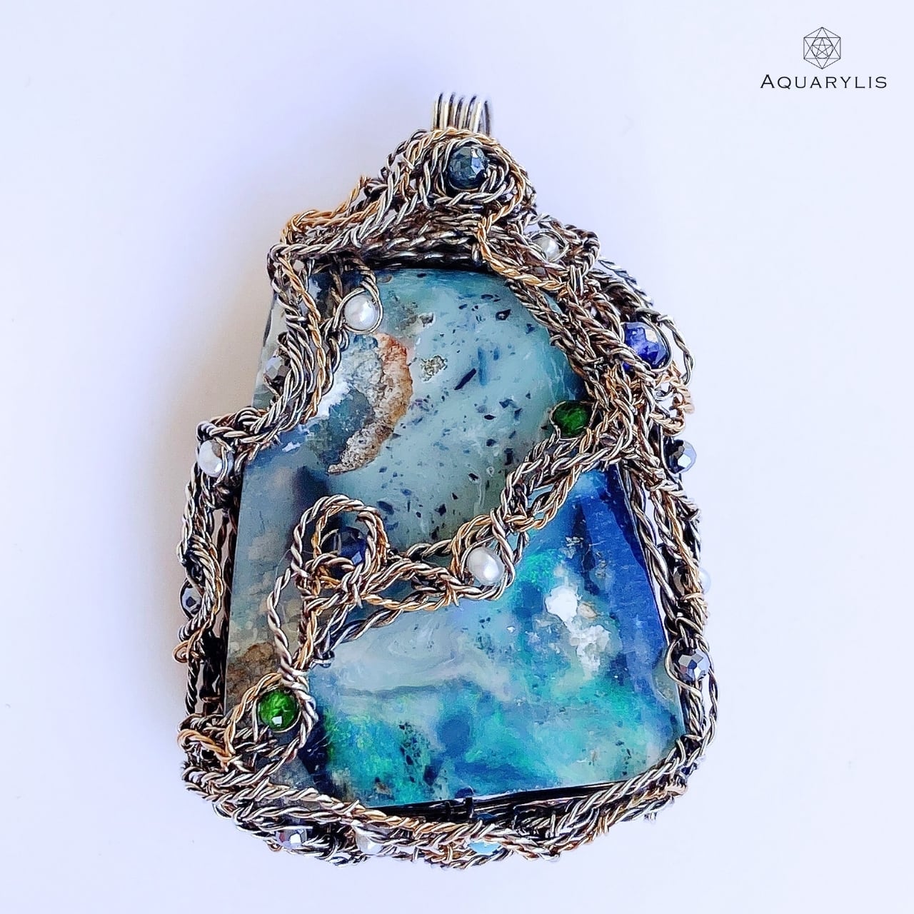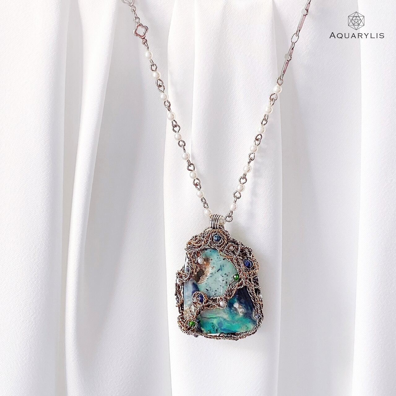 ・ブルーダイヤモンド、カヤナイト 、ダイオプテーズ、淡水パール、ヘマタイト、スリーピングビューティーターコイズを装飾宝石に使用。どの角度からペンダントを見ても、それぞれの美しさが楽しめる繊細なワイヤリングがほどこされています。